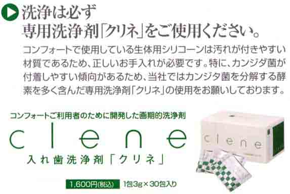 | A:コンフォートは生体用シリコーンを使用しているため,汚れが付きやすいので,必ず専用の入れ歯洗浄剤「クリネ」で毎日つけおきの洗浄をお願いしております。 |